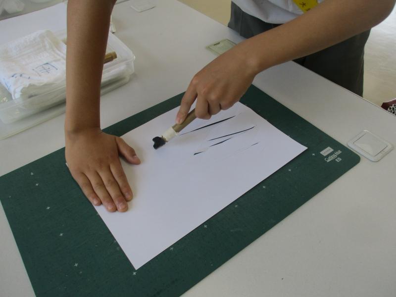 黒曜石のナイフで紙を切る体験をしました。あてる角度や場所によって切れ味が違うので、よく切れる場所を真剣に探しながら切っていました。