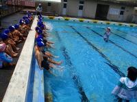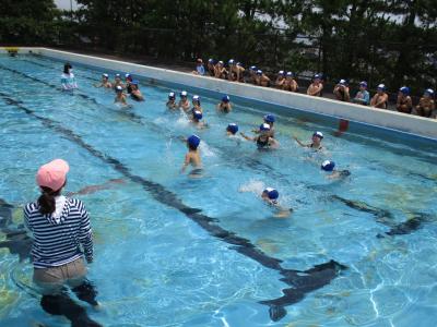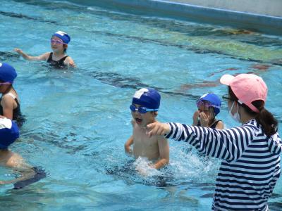 初めてのプールということで、まずは、プールサイドでのバスタオルの置き方、シャワーの浴び方から学習します。冷たいシャワーにびっくりする子ども達でしたが、プールの水はそれほど冷たくはありません。両足を動かして水しぶきをあげたり、少しずつ入水し、ジャンプしたり潜ったりにも挑戦。最後は、ジャンプしながら前進し、プールを横切って進みました。