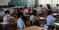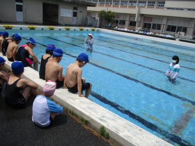 安全対策として、一度に入水するのはクラスの半分。残りの半分の子ども達は、ペアの子ども達の様子を見守ります。ペアの子が、普段と違う様子だったらすぐに先生に知らせることをお約束しました。また、マスクを外しての授業になるのですが、プールでは十分な間隔を開けることができないため、無駄なおしゃべりはしないで、授業に参加することもお約束しました。