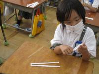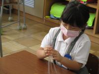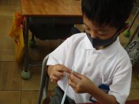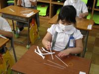 今日は、シャボン玉をつくるための道具をストローで作っていました。