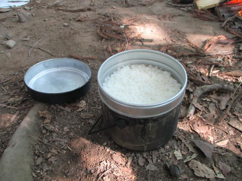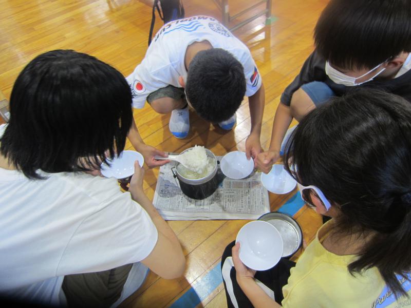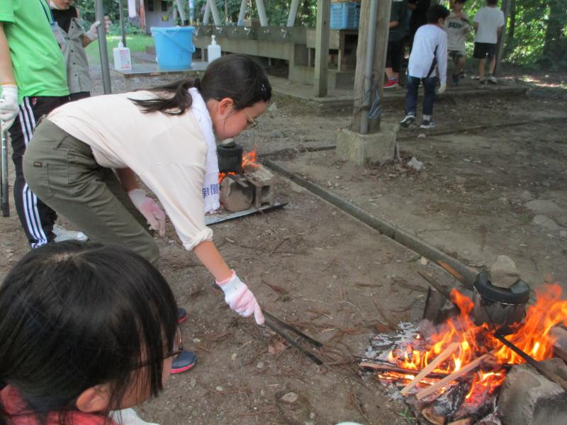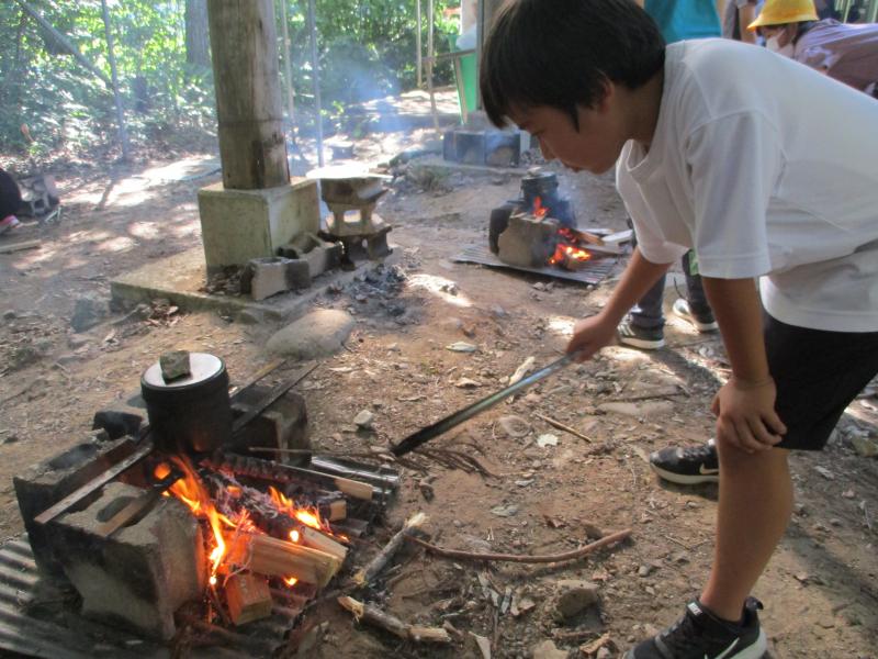 いつも炊飯器で炊いているご飯を、火起こしからスタートし、飯ごうで炊いた野外炊飯。燃料となる薪を探したり、風をおくって火加減を調整したりと経験したことのない体験に子どもたちはとても楽しんでいました。