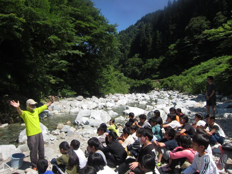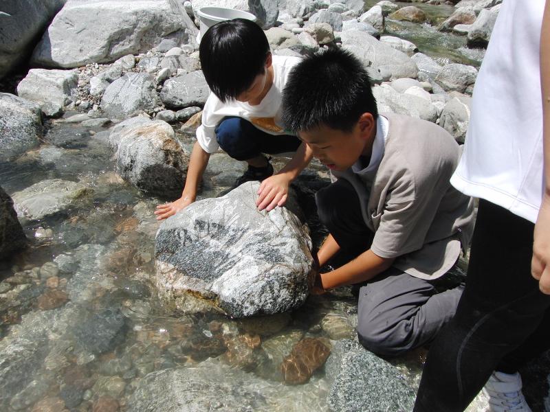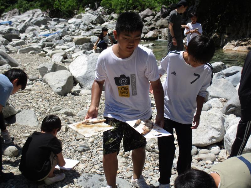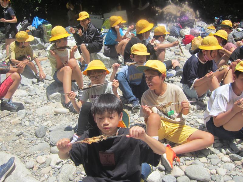 2日目にはイワナつかみをしました。自然の川の中で行いました。子どもたちは岩の隙間に入り込んだイワナをうまく取ることができていました。なかなか取ることができない子も仲間に手伝ってもらい全員が捕まえることができました。