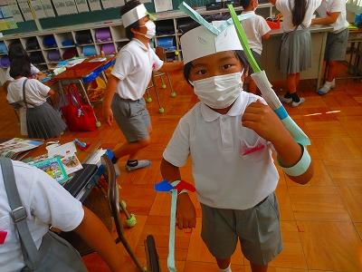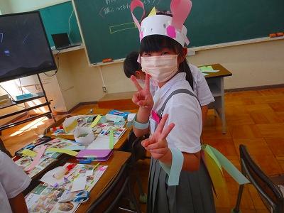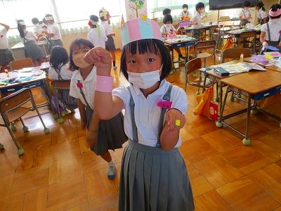 今日は、図工で「わっかからへんしん」の授業をしました。わっかの飾りを作って身に付け、変身しました。