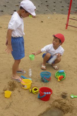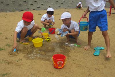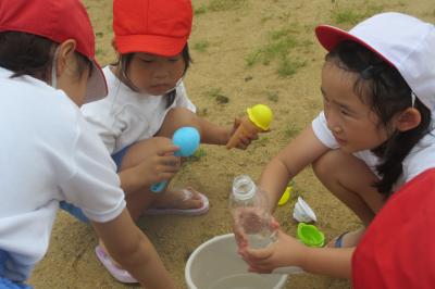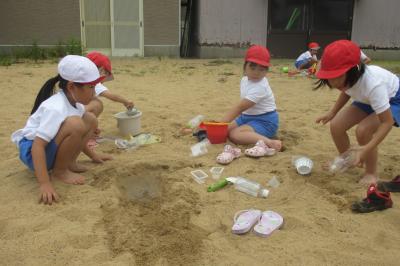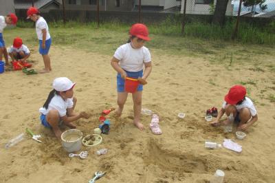 ペットボトルや家から持ってきたミニバケツに水を入れて、一生懸命砂場に運ぶ子。水が届くまでに小さな池や川の形を作るために掘り続ける子。バケツに泥水を作って「カフェラテ」づくりに励む子。友達と力を合わせてプールをつくろうと苦心する子。いろいろな楽しみ方がありましたが、どの子も時間を忘れて夢中になっていました。途中で裸足になる子も続出。砂や水に触れる手や足の感覚、友達との助け合う温かさを感じながらの楽しい時間でした。