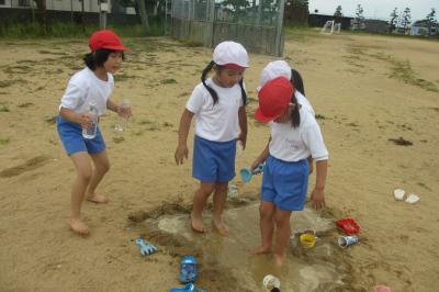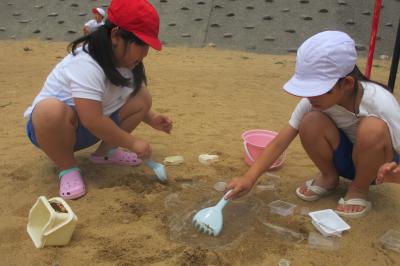 1年生が生活科の学習で、砂遊びをしました。家にある砂遊びセットをそれぞれに持ち寄りました。場所は、運動場の一角。