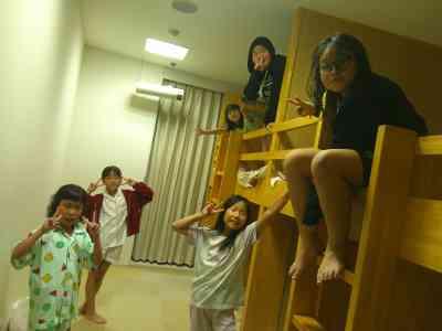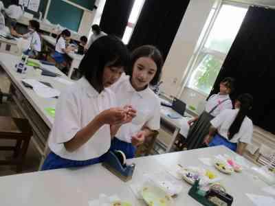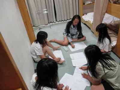 お互いの学校について紹介し、ベッドメイキングを教わりました。