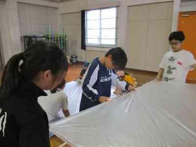 班で協力して、天井まで届くように熱気球を作りました。