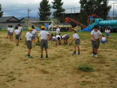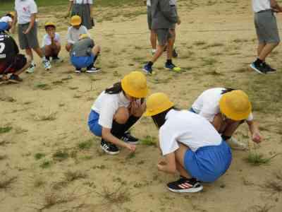 主に今回は、運動会で使う場所の石や草を全校で取り除きました。