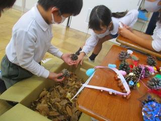制限時間内に、落ち葉の中に隠れている松ぼっくりを見つける遊びでした。