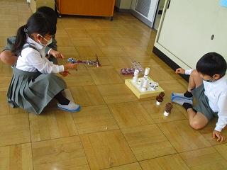 割りばしで作った銃で、松ぼっくりの的を当てる遊びでした。