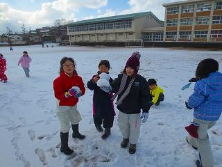 今日の2時間目にグラウンドで雪遊びをしました。ちょうど雪もやんで絶好のコンディションで雪遊びをすることができました。