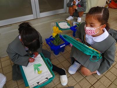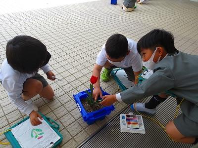 「葉っぱの先がとがっていて赤いよ!」「茎と葉っぱの色はすこしちがうね。」と、気付いたことを友達と話しながら楽しそうに観察する姿がとても微笑ましかったです。