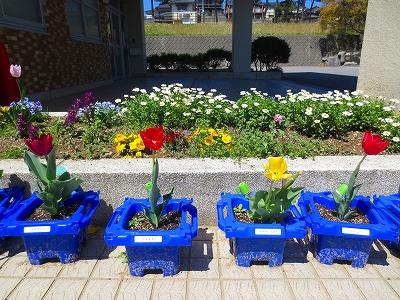 1年生の時に植えたチューリップが元気に育ち、どの子もうれしそうにしていました。