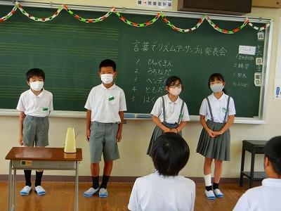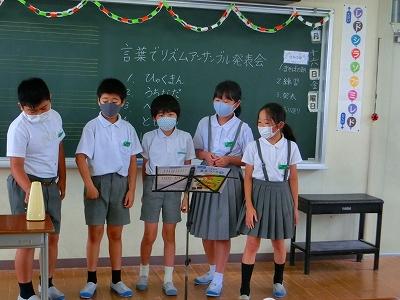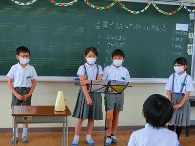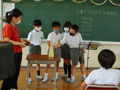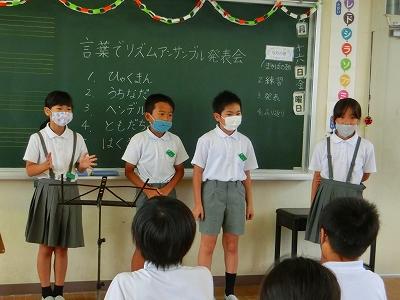 音楽の時間に4文字の言葉を使ってリズムを作る、リズムアンサンブルをしました。