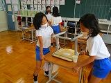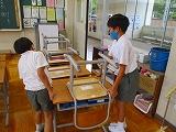 3年生の机と椅子が新しくなりました。今までのものより、少し重たくなったため、掃除のときは2人で協力して運んでいます。