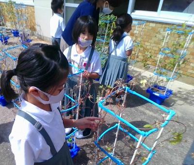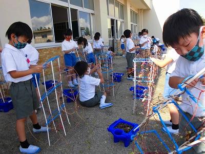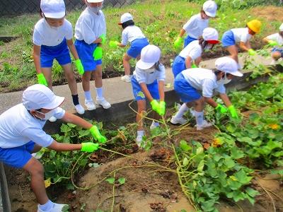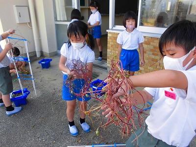 まず、支柱からつるを外しました。絡まったつるを外すのに子どもたちは大苦戦。それでも、最後まで1本1本大切につるを外していました。