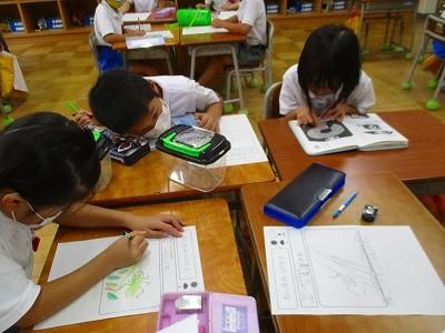 教室に戻って、見つけた虫の観察をしました。体の様子や動き方などをカードに記録しました。子どもたちは、友達と特徴を見つけ合いながら、楽しそうに観察していました。