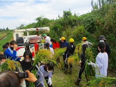 刈り取った稲は、束にして大事そうに抱え、コンバインに運んでいました。