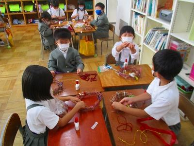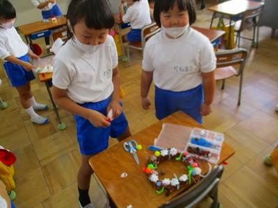 「ここ持ってあげるよ!」「こんな風にすればうまくいくよ!」と、友達と声を掛け合いながら、なかよく協力してリースを完成させていました。