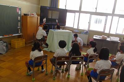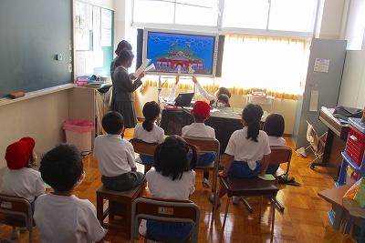 英語で紹介することに挑戦してきました。話している英語の台詞とペープサートの動きを合わせることで表現が身につくように何度も練習しました。