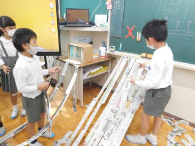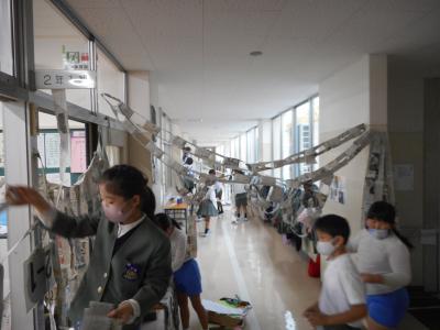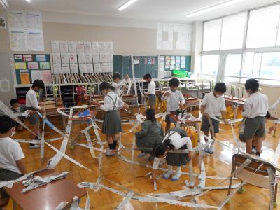 10月21日に図工の「つないでつるして」をしました。2年生の教室と廊下を使い、思い思いに新聞紙をつないだり、つるしたりしていました。いつもと雰囲気の違う教室や廊下を見て、大興奮でした。友だちと協力する姿がたくさんみられました。