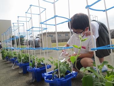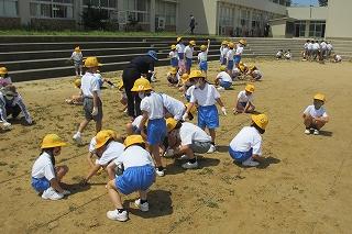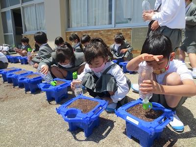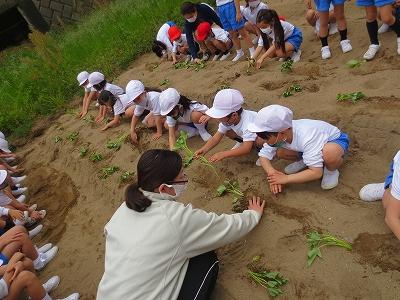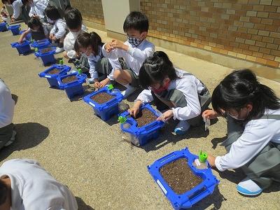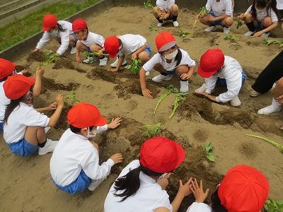 土を掘り、苗を横に寝かせて植えました。よく育つように、どの子もていねいに植えていました。みんな秋を楽しみにしていました。