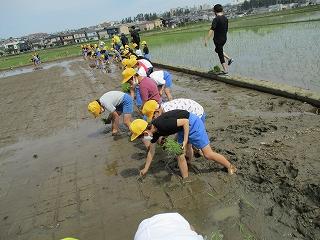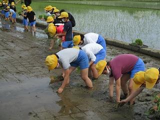 最初は、ぬかるんだ足元に恐る恐る足を動かしていましたが、だんだんと慣れ、植え方も上達し、田全体に余すところなく苗を植えることができました。