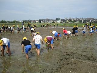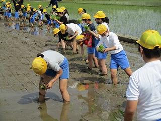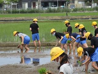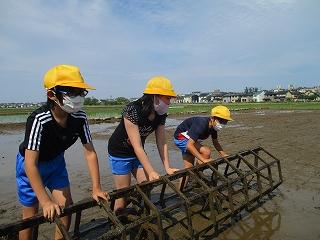 良い天気に恵まれ、絶好の田植え日和となりました。久しぶりに再会した白帆台小学校5年生と共に高道さんのご指導の下、田植え体験を行いました。