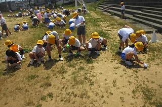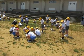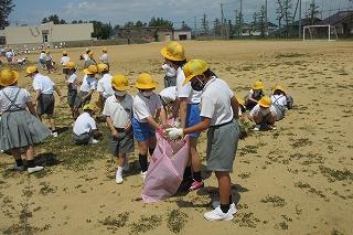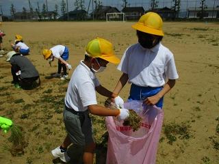 暑い中、どの児童も無言でもくもくとたくさんの草を取る姿が見られました。運動場がきれいになり、使いやすくなりました。
