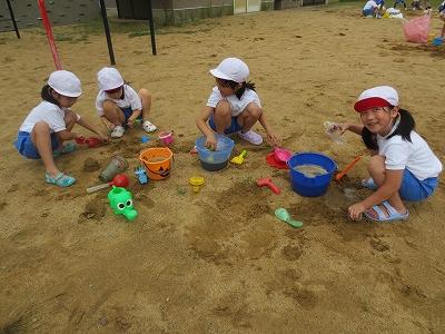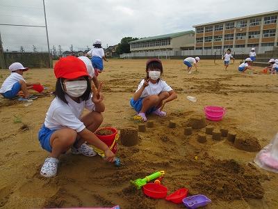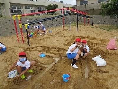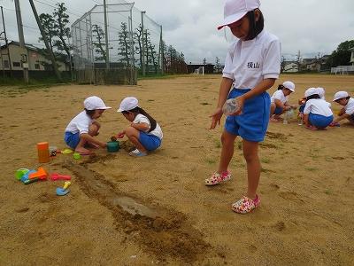 砂を集めて山を作ったり、水路を作ったりと、友達と協力しながら楽しそうに遊ぶ姿が見られました。