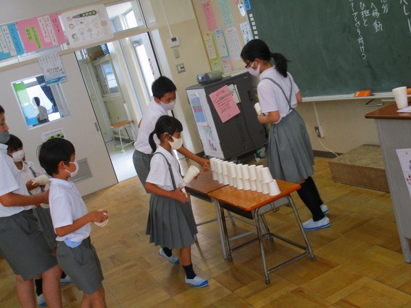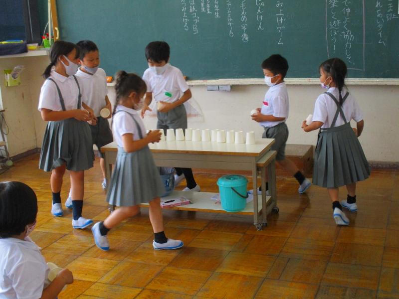 どの児童も真剣な顔でコップを積んでいたり、笑顔が見られたり、楽し