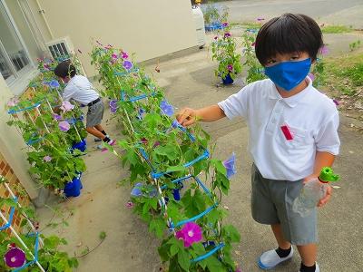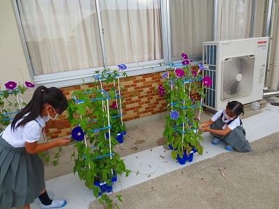 毎日の水やりをがんばった子どもたち。あさがおの花が咲いて、どの子もうれしそうでした。「3つ咲いたよ!」「みずいろが咲いたよ!」と、咲いた花の数や色を友達と報告し合う姿がとても微笑ましかったです。