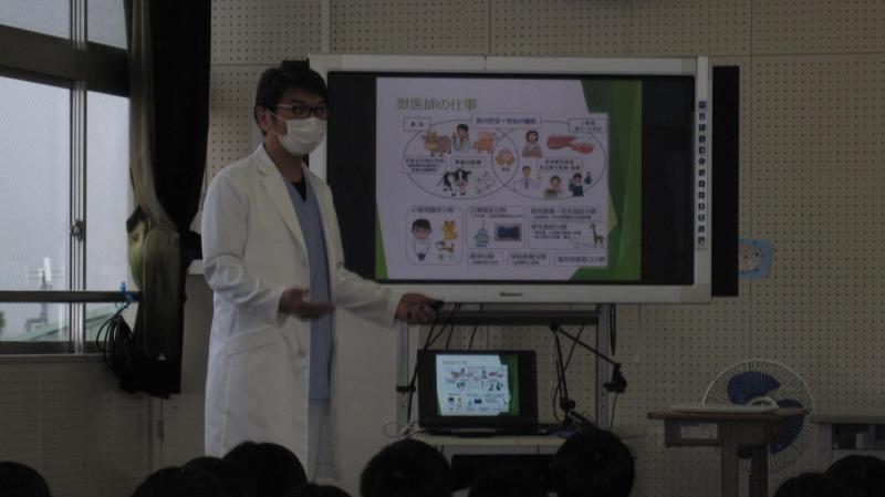 田村先生からは、自身が獣医になったきっかけになった猫と犬の話や獣医になってからの経験に基づいた貴重なお話を聞くことができました。中には、癌になった動物の写真や猫の帝王切開の映像など目を背けたくなるようなものもありましたが、子どもたちは真剣に映像を見たりお話を聞いたりしていました。映像から子どもたちは、一人一人何かを感じ取っている様子がうかがえました。