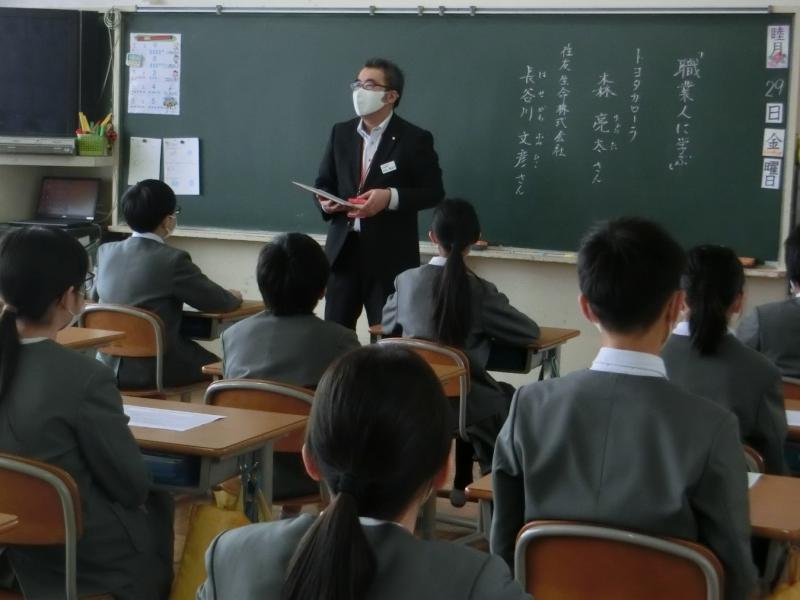 トヨタカローラの森さんと住友生命株式会社の長谷川さんを講師としてお招きして、それぞれの職業に関わるお話を聞きました。