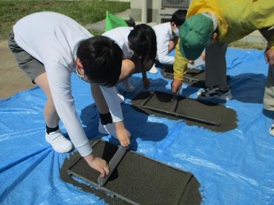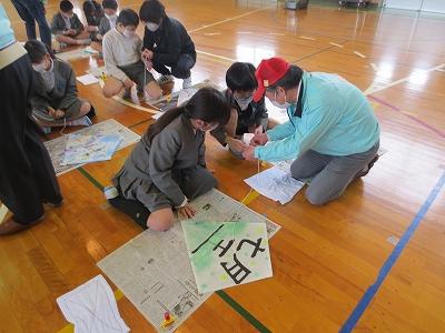 日本海内灘砂丘凧の会の方々をお招きして、凧作りを行いました。大根布小学校の凧作りは「漢字一字に思いをのせて」をテーマとし、子どもたち一人一人が、思い入れのある漢字一字を凧にデザインしました。