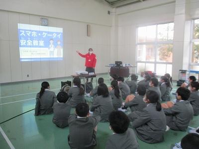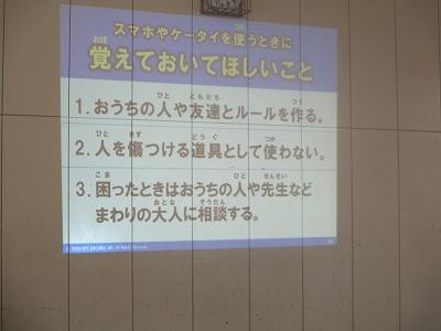 今日は、高学年でスマホ・ケータイ安全教室を行いました。近年、スマートフォン等の急速な普及に伴い、無料通話アプリやSNS、オンラインゲーム等により高い利便性が得られる一方、長時間利用による生活習慣の乱れや、不適切な利用により、トラブル、いじめやプライバシー上の問題につながるケースも見られています。またSNSを起因とする青少年の犯罪も多発しています。こうしたケースを防ぐために、子どもたちは自分たちの生活経験をふり返りながら、情報機器の安全な使い方について学びました。