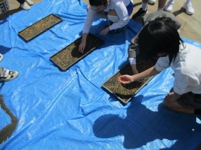 毎年、米作りでお世話になっている高道さんに、稲の苗づくりの仕方について教えていただきました。寒冷紗(かんれいしゃ)やビニールをかけて直射日光を遮ったり、寒さ対策をしたりしました。田植えを行う日まで毎日たっぷりの水をやり、丈夫な苗を作りたいです。