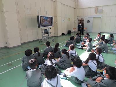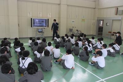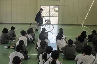 警察の方に来ていただいて、動画を見ながら標識について学んだり、実際の自転車を使って、ブレーキ・ライトなど点検する箇所や自転車の安全な乗り方を教えていただいたりしました。ヘルメットの重要性についてもお話しいただきました。児童は真剣に話をきいていました。学んだことを活かして安全に気を付けてルールを守って自転車に乗ってほしいです。