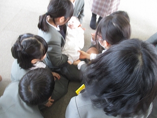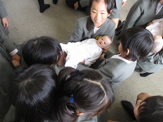 子どもたちは興味津々で聞いていました。最後に赤ちゃんと同じ重さの人形をだっこさせてもらいました。