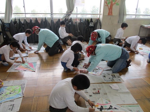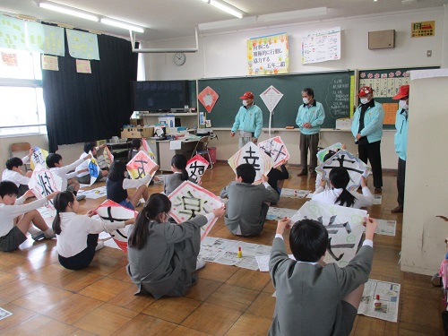 今日は、日本海内灘砂丘 凧の会の方々にご指導をいただき、凧作り体験を行いました。今年は「揚げよう!私たちの思い」をテーマに、一人一人が漢字一字に思いを込めてデザインし、作りました。