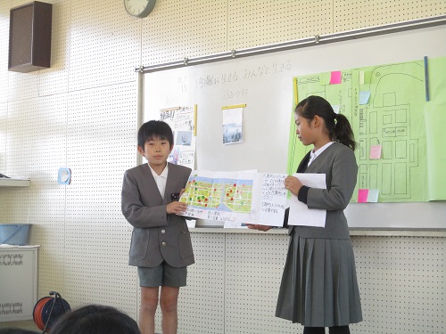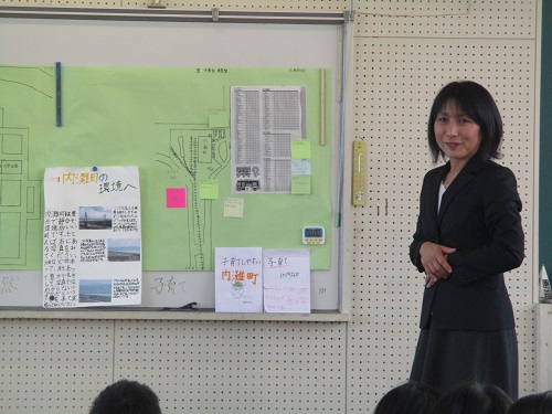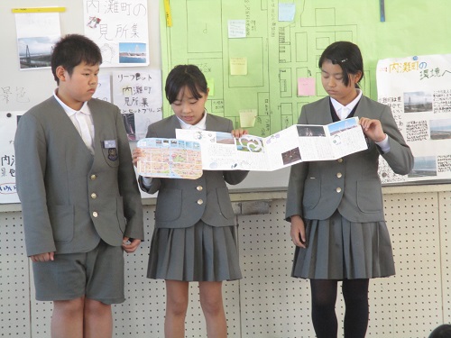 今日は、内灘町学びの風推進協議会の荒木さんをお招きし、総合の学習発表会を行いました。5年生は4月から、「内灘町のよさを多くの人に知ってもらいたい。」「内灘町にたくさんの人が来てほしい。」という思いから、学習を進めてきました。
