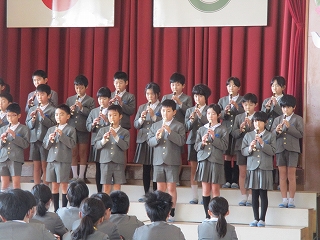 3年生で使い始めたリコーダーで、校歌を吹き、「四季の眺め」や「規律」、「勤勉の二字」に6年生のすてきなところを当てはめていきました。リコーダーの輪唱がとてもすてきでした。