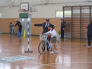 ブレーキをかけながら自転車に乗ることや、左右と後ろを確認してから発進すること、横断歩道では降りて通行することなどをわかりやすく教えていただきました。
