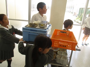 「給食のワゴン、一緒に気を付けて運ぼうね。」