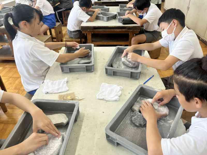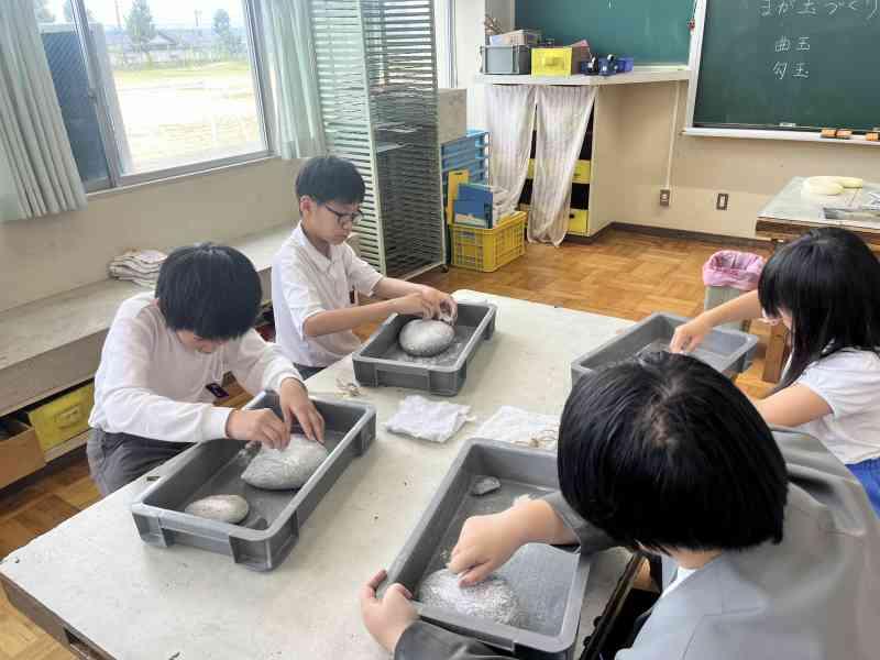 また、縄文人が身に付けていた「まが玉」作りにも挑戦しました!石を擦り合わせ、自分だけのまが玉を丁寧に仕上げていきました。