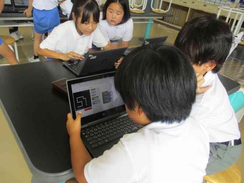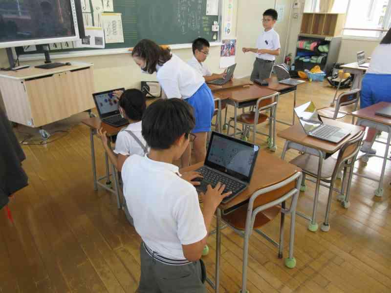 休み時間も、友達と相談しながらプログラミングをしていました。