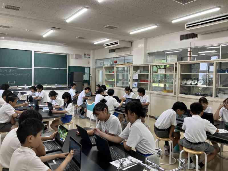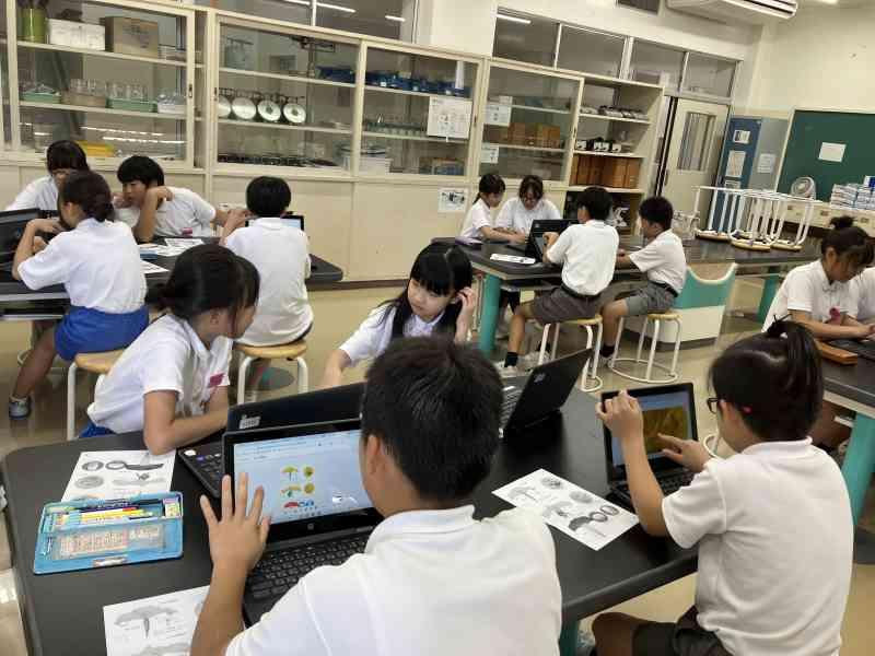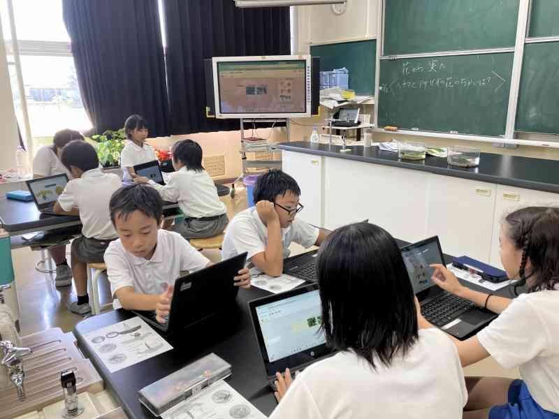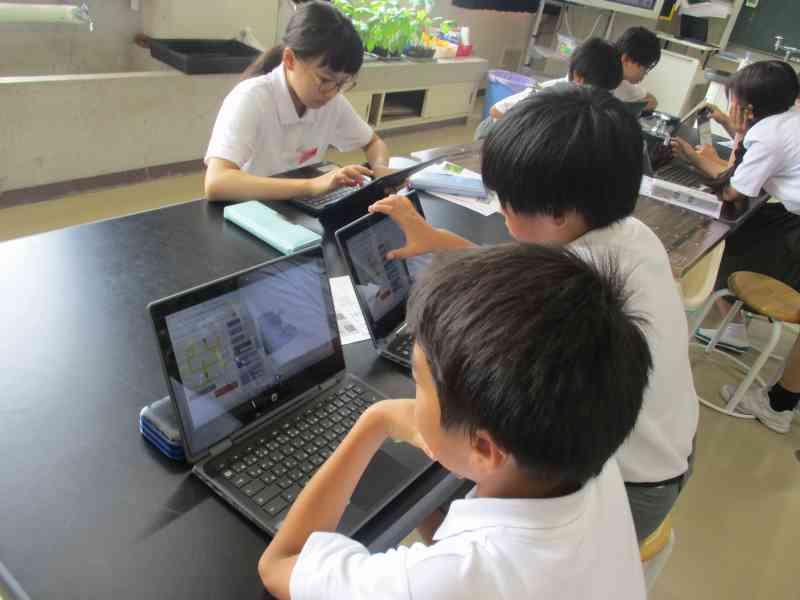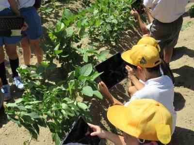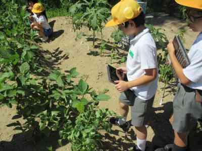 夏休み前に植えた大豆がどのように生長しているかを観察しました。外が暑かったので、直接観察する時間は短くなってしまいましたが、クロームブックで写真を撮り、観察しました。