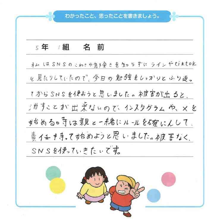 子どもたちは、SNSの危険性や怖さを知り、SNSとの付き合い方について、真剣に考えていました。