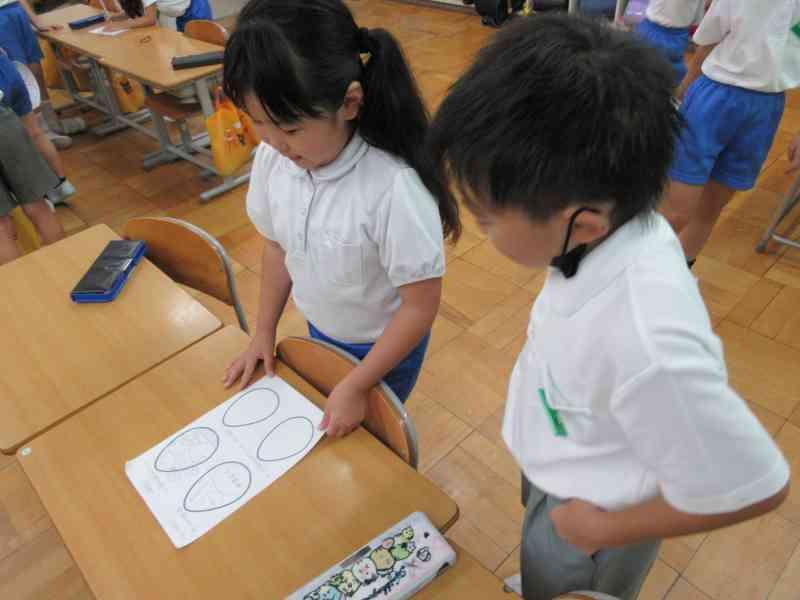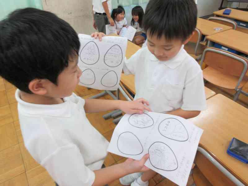 「たまごの中は?」という活動をしました。たまごの中に自分の考えをキーワードで書き出しました。①夏休み楽しかったこと②2学期がんばりたいことをテーマに自分たちの思いを交流しました。