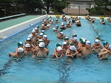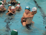 入水したら、6年生におんぶしてもらい、ぐるぐる洗濯機のように波を起こしながら歩き、流れるプールを完成させました。